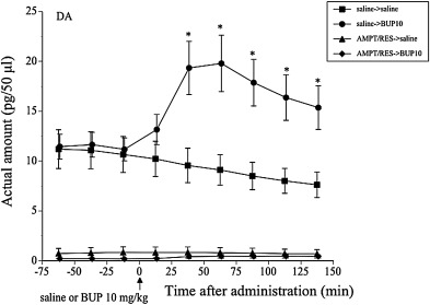Fig. 9. Alterations in actual measured values of DA in dialysates obtained from the CPu before and after subcutaneous administration of saline or 10 mg/kg BUP. The mice were pretreated with saline or AMPT + RES. Symbols denote the mean values that were plotted against the midpoint of the measurement period, and vertical lines indicate the standard error of the mean (SEM). *P < 0.05 compared with the saline pretreated control. N = 6–8. |