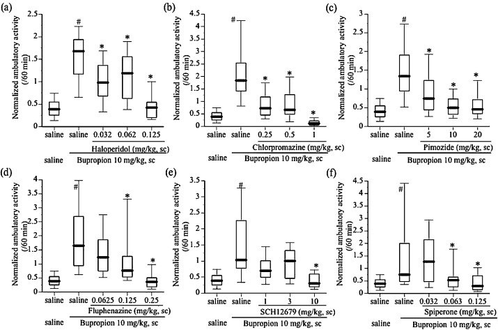 Fig. 6. Effects of 0.032–0.125 mg/kg haloperidol (HAL) (a), 0.25–1 mg/kg chlorpromazine (CPZ) (b), 5–20 mg/kg pimozide (PIM) (c), 0.0625–0.25 mg/kg fluphenazine (FLU) (d), 1–10 mg/kg SCH12679 (SCH) (e), and 0.032–0.125 mg/kg spiperone (SPI) (f) on an effect of 10 mg/kg BUP on ambulatory activity. Data are shown using a box plot on normalized total ambulatory activity for 60 min after administration. (a) N = 20, (b) N = 20, (c) N = 30–40, (d) N = 30-50, (e) N = 10, (f) N = 18. #P < 0.05 compared with saline + saline. *P < 0.05 compared with saline + BUP. |