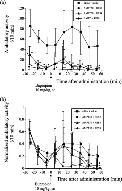 Fig. 5. Effect of pretreatment with saline or α-methyl-p -tyrosine (AMPT) + reserpine (RES) on response of ambulatory activity to 10 mg/kg BUP. (a) Changes in actual ambulatory activity. (b) Changes in normalized ambulatory activity. Symbols show the median values of ambulatory activity for each 10-min period that were plotted against the midpoint of the measurement period, and vertical lines denote the first and third quartiles. *P < 0.05 compared with saline control. N = 32–36. |