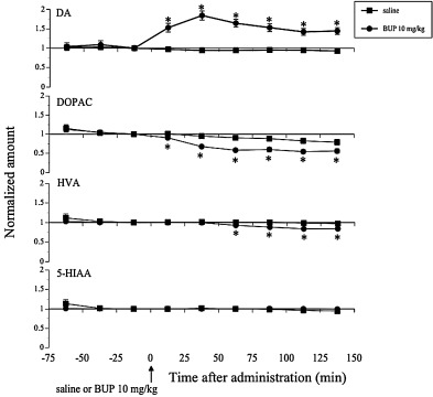 Measuring 5-HT was difficult because the retention time was close to 25 min in many cases. In addition, as the NE and MHPG measured in the dialysates in the present study were insensitive to pretreatment with AMPT and RES, the measured values for NE and MHPG were believed to be derived from other obstructive sources. Thus, we excluded NE, MHPG, and 5-HT from the examinations. Alterations in DA, DOPAC, HVA, and 5-HIAA in normal mice after administration of saline or BUP were analyzed using two-way repeated ANOVA followed by the Dunnett test that compared BUP data with saline data at each time point. Alterations in DA, DOPAC and HVA after administration of saline or BUP in the mice pretreated with AMPT/RES or saline were analyzed using three-way repeated ANOVA followed by two-way ANOVA, one-way ANOVA, and the Dunnett test.