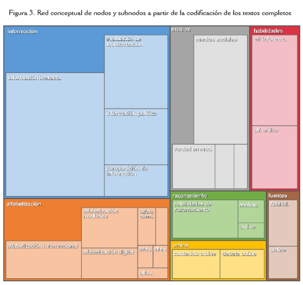 El cluster amarillo identifica el concepto «medios de noticias» y su vinculación con la «lectura crítica», la «credibilidad» o los «prejuicios». Finalmente, el cluster de color morado recoge la alfabetización mediática y sus relaciones con la «alfabetización científica», la «educación cívica» o los «medios digitales». Para desarrollar en profundidad esta red conceptual se analizaron los textos completos de los artículos mediante el uso de una codificación automática con NVivo 12 Plus. Se obtuvieron 13 nodos automáticos que, posteriormente, fueron fusionados por su afinidad temática en siete nodos (Figura 3). Los tres nodos principales identificados fueron «alfabetización», «información» y «medios». El primer nodo «alfabetización» incluye diferentes subnodos como «alfabetización mediática», «alfabetización informacional» o «alfabetización digital». El segundo nodo «información» está conformado por los subnodos «desinformación», «evaluación informativa», «información política» y «compartición de información». Y, en el tercer nodo «medios» emergen los subnodos «medios sociales», «efectos de los medios», «juicio de la verdad de los medios» e «influencers de medios sociales». Los cuatro nodos restantes se identifican con los conceptos «fuentes», «habilidades», «online» y «razonamiento». Este doble análisis conceptual nos ofrece un marco teórico de gran utilidad para los estudios sobre alfabetización y desinformación, así como para los diseños instruccionales que apliquen métodos didácticos eficaces ante el problema de las noticias falsas.