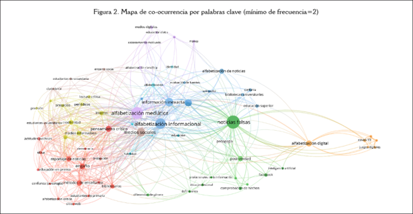 Para analizar la red de conceptos se obtuvo la identificación de una serie de clusters generados por la co-ocurrencia de las palabras-clave de los artículos. Un primer cluster, de color verde, identifica el concepto de «Fake news» y su relación con la «post-verdad», el «fact-checking» o la «pedagogía». El cluster azul incluye los conceptos de desinformación («disinformation» y «misinformation») y sus vínculos con las alfabetizaciones informacional y de noticias. El cluster rojo reúne los conceptos de «pensamiento crítico» y sus relaciones con el «engaño», los «métodos de enseñanza» o los «bibliotecarios».