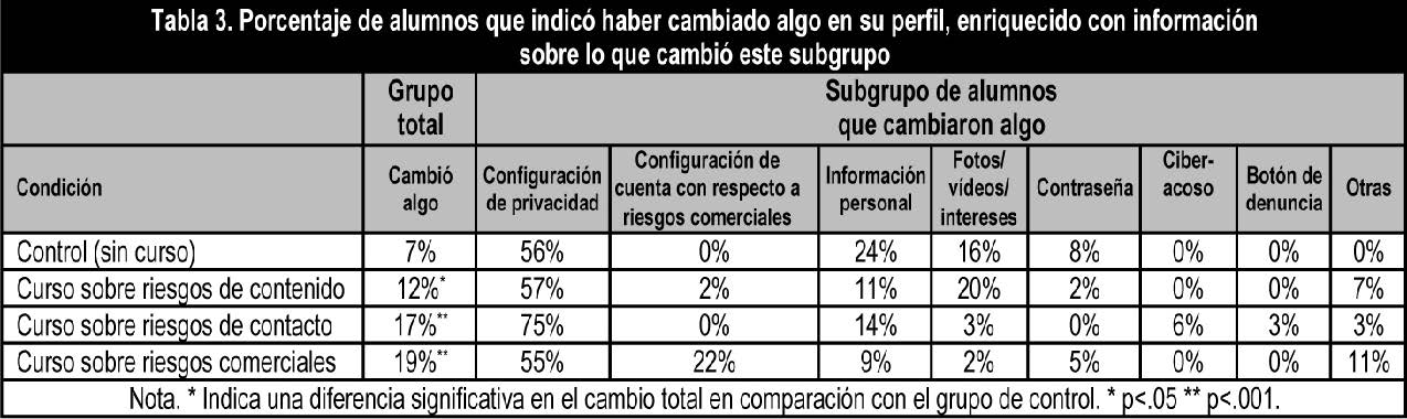 Sin embargo, si analizamos las respuestas a las preguntas sobre si han cambiado algo en su perfil (una forma de medir el comportamiento más directa, pero también más específica), encontramos algunas diferencias. En el grupo de control, el 7% de los alumnos indicaron que habían cambiado algo en su perfil, lo que implica que incluso una mera encuesta sirve para alentar a algunos adolescentes a comprobar y modificar su perfil. Sin embargo, de aquellos que siguieron un curso, hubo un número más significativo de alumnos que cambió algo (16%, ?²=18.30, p<.001). Las respuestas a la pregunta abierta sobre qué cambiaron exactamente nos proporciona más datos sobre esta información. Los resultados del análisis del contenido de estas preguntas abiertas se pueden encontrar en la tabla 3. Como era de esperar, cuando los alumnos asistieron al curso sobre riesgos de contenido, principalmente cambiaron la configuración de privacidad y el contenido de su perfil (fotos, intereses, información personal). Cuando siguieron el curso sobre riesgos de contacto, cambiaron en su mayoría su configuración de privacidad y su información personal (incluyendo la información de contacto). Cuando participaron en el curso sobre riesgos comerciales, cambiaron principalmente la configuración de privacidad y de la cuenta, protegiéndose de los riesgos comerciales. Estos resultados indican que todos los cursos –incluyendo el curso sobre riesgos comerciales– tuvieron un impacto en el comportamiento de un número importante de adolescentes. No obstante, hay que subrayar que una gran cantidad de los adolescentes que asistieron a algún curso no realizó ningún cambio.