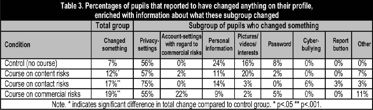 Still, if we analyze the answers to the question whether they changed anything on their profile (a more direct but also more specific measure of behavior), we do find some differences. In the control group, 7% of the pupils indicated having changed something on their profile, implying that even a survey encouraged some teenagers to check and change their profile. However, of those who followed a course, significantly more pupils changed something (16%, ?²=18.30, p<.001). Answers to the open question of what exactly they changed give us more insight in this information. The results of the content-analysis of these open questions can be found in table 3. As can be expected, when pupils had a course on content risks, they mainly change privacy-settings and the content of their profile (pictures, interests, personal information). When they followed a course on contact risks, they mostly change their privacy-settings and their personal information (including contact information). Participants of the course on commercial risks mostly changed their privacy-settings and their account-settings, protecting themselves against commercial risks. These results indicate that all courses – including the course on commercial risks- had an impact on the behavior of a significant amount of teenagers. Still, it should be noted that a lot of teenagers who did receive a course, reported that they did not change anything.