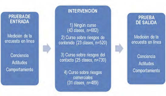 Para comprobar si se lograron estos objetivos, se estableció un estudio cuasi-experimental en el que se utilizaron y evaluaron estos paquetes en un entorno escolar real. A diferencia de lo que ocurrió en algunas investigaciones de intervención previas donde los investigadores participaron activamente (Del-Rey & al., 2012), en este caso fueron los profesores los responsables de dirigir la intervención para asegurar su validez externa. Se planteó la siguiente pregunta clave en la investigación: ¿influiría una intervención sobre riesgos de contenido, contacto o comerciales en la conciencia, la actitud y/o el comportamiento de los adolescentes con respecto a estos riesgos?