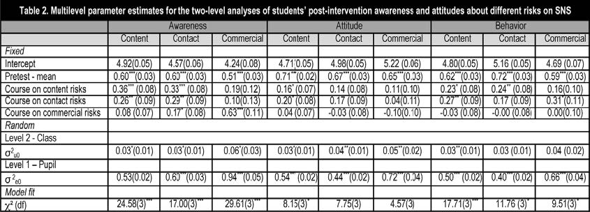 Second, the results show that the intervention is a significant predictor of all three awareness-variables. Indeed, a positive impact of the given courses on awareness can be observed: a course on content risks or contact risks has positive effects on the awareness of both those risks and a course on commercial risks has a strong positive influence on the awareness of commercial risks. Moreover, no significant between-class variance is left, indicating that the initial between-class variance can be fully explained by the condition that classes were assigned to. This also implies that there are no important other predictors left of the posttest scores on class-level, such as teaching style, or differences in what has been said during class discussions.