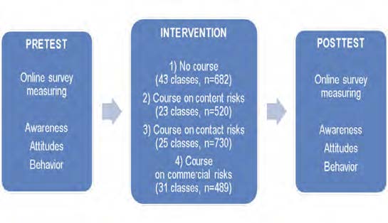 To verify whether these goals were obtained, a quasi-experimental study was set up in which these packages were implemented and evaluated in authentic classroom settings. In contrast to some previous intervention research where researchers were actively involved in the intervention (Del Rey & al., 2012), teachers were responsible for guiding the intervention to assure external validity. The following research question was put forth: does an intervention about content, contact or commercial risks have an impact on the awareness, attitudes and/or behavior of teenagers with regard to these risks?