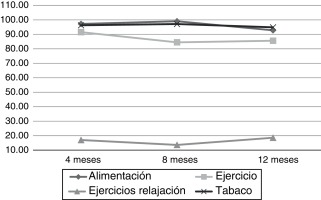 Por último, a los 12 meses se reducen por debajo del nivel inicial las recomendaciones sobre alimentación y se eleva ligeramente la realización de ejercicio. En resumen, se puede decir que la alimentación y el consumo de tabaco se mantienen a lo largo del tiempo, siendo el ejercicio físico el que tiene un menor seguimiento.