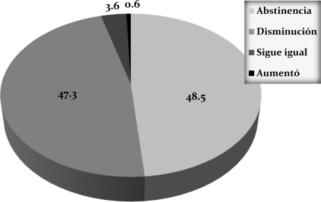 De acuerdo a los cambios percibidos tras participar en el programa, 83.0% mencionó que su situación emocional había mejorado. En cuanto al estado de salud, 72.0% de los sujetos observaron cambios favorables. En lo que respecta a la interacción social, la tercera parte de los pacientes percibió una mejoría en la relación con la familia, 64.1% mejoró la interacción con otras personas, 55.5% optimizó su integración en el contexto laboral y/o escolar. En cuanto a la capacidad para enfrentar el ofrecimiento de bebidas con alcohol, 87.5% se percató que sus estrategias de afrontamiento eran más eficaces (Gráfica 1 ). Del mismo modo, 85.0% de los sujetos (60 personas) que habían participado en algún tipo de actividad delictiva y ya no lo hacían, atribuyeron al tratamiento el abandono de esta conducta.