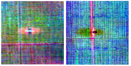 En la figura 7 se observan las representaciones RGB de los resultados obtenidos en las inspecciones termográficas de dos probetas ensayadas. En la imagen de la izquierda se pueden identificar dos delaminaciones en las capas más superficiales, indicadas por una pequeña zona blanca y por una zona más oscura entorno al punto de impacto. La forma que presentan dichas delaminaciones es elíptica de eje mayor en posición horizontal para la delaminación menor (y más superficial) y vertical para la mayor (y más profunda). Un análisis del estado de las capas más profundas permite identificar una tercera delaminación indicada en la misma imagen por una zona de mayor área y de tonos rojos entorno al punto de impacto.