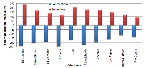 Si bien el sesgo promedio entre las series de SPI tiende a cero, para casos puntuales se observa una marcada diferencia. En la Figura 6 se presentan los valores máximos observados (%) de sobreestimación y de subestimación entre las series de los índices calculados a partir de TRMM respecto de los que fueron calculados con datos observados de precipitaciones, en cada una de las estaciones utilizadas. Se observa que en general, las diferencias máximas son menores en las dos estaciones de llanura (Marcos Juárez y Río Cuarto).