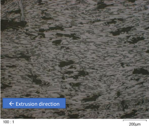 Debido a la naturaleza lineal del proceso de extrusión y a la corta fase de compactación que se da en la punta de la extrusora, el material obtenido tras la incorporación de la fibra en la matriz termoplástica, la fibra se encuentra homogéneamente distribuida en el núcleo y con una direccionalidad predefinida, en el sentido del flujo de la extrusión. Obteniendo de esta manera un filamento liso en el que la fibra ha sido orientada en la dirección del filamento, debido a la fluencia del polímero fundido.