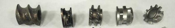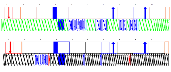 De esta manera, las fibras son introducidas a través de unos husillos dentro de la extrusora, donde durante el proceso de mezclado con el polímero, sufren torsiones y esfuerzos mecánicos que las pueden romper, reduciendo su tamaño original y por tanto impactando en las propiedades mecánicas que éstas otorgan al material compuesto definitivo/obtenido [23]. La Figura 3 ilustra varias configuraciones de husillos desarrollados durante el proyecto Eco-Clip.