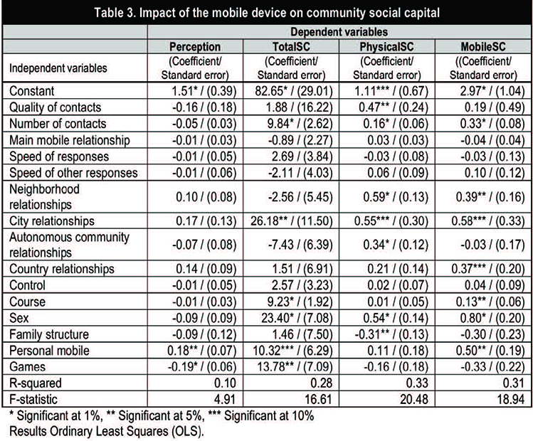 With regard to physical social capital, made up of variables that have to do with the activities undertaken and the composition of the communities in this environment, variables such as the number of contacts and the quality resulted significant. The quality of the contacts consisted of a variable created by dividing the number of total contacts with which the adolescents communicate with using their mobile phone and the principle contacts. For all practical purposes, it can be said that the larger the number and quality of contacts, the larger is the impact of the use of mobile phones on physical social capital. Another significant variable was relationships with people from more diverse environments. Finally, gender and family structure influence these resources.