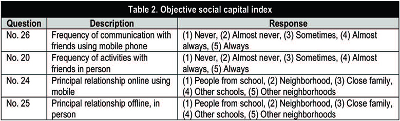 The last question of the questionnaire was used to measure perceived social capital among adolescents. Respondents indicated whether they believe that their relationships were improved via mobile communication. These results were compared with an objective measure of social capital. For both types of social capital, an ordinary least squares (OLS) analysis was used to understand how each type of social capital depends on the variables of gender academic level, family structure, and other variables related to mobile usage.