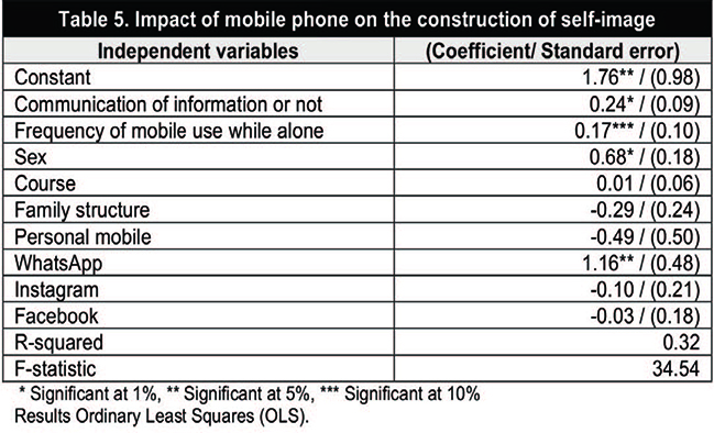 The third and final analysis shown in Table 5 has to do with the variables that significantly impact the construction of self-image. In the case of sex, females (or young women) tend to be the ones who engage in practices such as changing profile pictures more frequently or giving greater importance to the comments received via mobile phones. The needs to communicate everything that happens to oneself and to check their mobile phone when alone are variables that, in general, affect the process of self-image. Finally, among the applications, WhatsApp resulted especially significant, meaning that this could reflect the behavior of adolescents who need to construct their self-image by means of the Internet.
