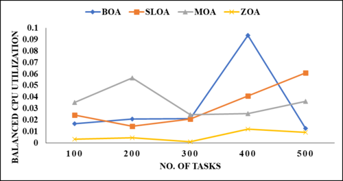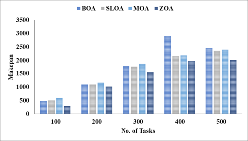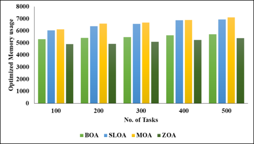 The ZOA model then calculates the makespan for the 100th task to be 100 299 42.7248 0.00338 4893.05 and the balanced CPU utilization to be 6950. Then, the 200th task, with a duration of 1013 45.1718, balanced CPU utilization of 0.00461, optimized memory utilization of 4915.5, and prioritization of 50,900, was executed. The 300th task was completed with a duration of 1546 iterations, an energy consumption of 48.2737, balanced CPU utilization of 0.00125, optimized memory utilization of 5085.77, and prioritization of 70,850. Following that, the 400th task was executed, with a duration of 1972, an energy consumption of 55,4123, balanced CPU utilization of 0.01240, optimized memory utilization of 5241.27, and prioritization of 80,800. Following that, the 500th task was executed, with a duration of 2015, an energy consumption of 61.9782 0.00934, an optimized memory usage of 5383.95, and a prioritization of 81,750. The proposed model explains the results in terms of makespan, energy consumption, task priortitization, memory usage and balanced CPU utilization. In future work, the results will be improved by adding resource utllization, number of overloaded tasks, training time reduction, etc.
