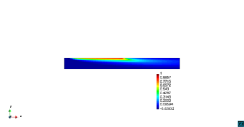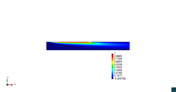 En la Figura 14 se muestran los resultados de la simulación numérica de este problema en para los dos métodos ASGS y OSS y para los cuatro grados polinómicos de las funciones de forma, y observando en todos los casos que los resultados son los esperados en concordancia con los datos del problema. Se visualiza el efecto de la convección dominante, ya que se observa que la concentración que se prescribe como condición de contorno se transporta al interior de dominio con poca difusión. En ninguno de los casos considerados se aprecian oscilaciones, que es el objetivo de los métodos de estabilización.