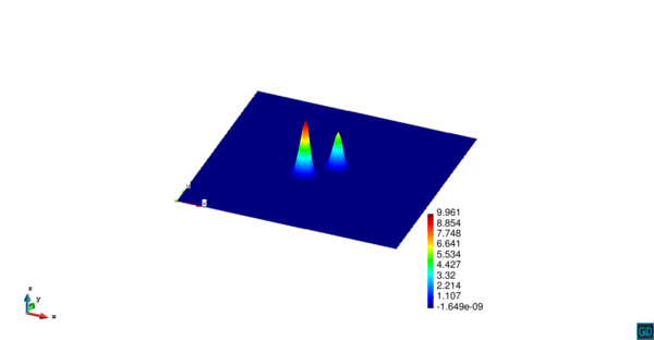 Un flujo uniforme con y está impuesto en todo el dominio. La concentración inicial de contaminante está dada por la siguiente suposición de dos distribuciones Gausianas centradas respectivamente en y en , dada por: