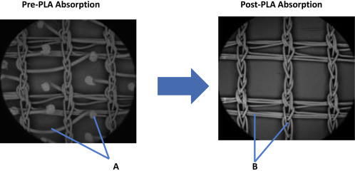 Figure 3. Parietex ProGrip mesh pre- and post- polylactic acid (PLA) absorption. (A) Monofilament resorbable PLA microgrips; (B) monofilament nonresorbable polyethylene terephthalate textile. |