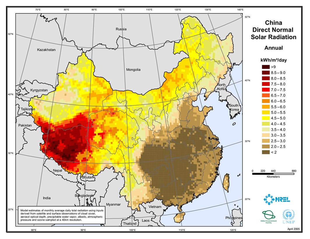 Figure 1. Direct normal solar radiation in China. (Note: This map was created by the National Renewable Energy Laboratory for the U.S. Department of Energy with data provided by UNEP and the Global Environment Facility.) |