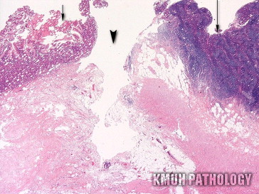 Figure 3. Pathologic photograph (hematoxylin and eosin stain, 20×) reveals the connection tract (arrowhead) between the appendix (long black arrow) and Meckel diverticulum (short black arrow). |