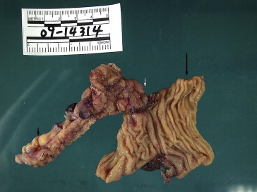 Figure 2. Appendix (short black arrow), fistula (white arrow), and Meckel diverticulum (long black arrow). The ileum measures 7 cm in length and 5.2 cm in width. The appendix measures 6 cm in length and 1.1 cm in diameter. The mass lesion measures 3.7 × 2.5 × 1.4 cm in size. Grossly, the mucosa of the small intestine is edematous and congested. After dissection of the appendix, it shows connection between the apex of the appendix and the mass lesion. |