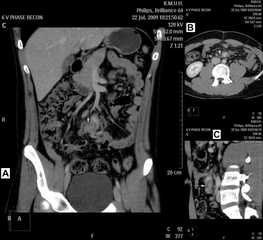 Figure 1. Fistula (arrow) of Meckel diverticulum and apex of appendix; (A) coronal view; (B) axial view; and (C) sagittal view. |