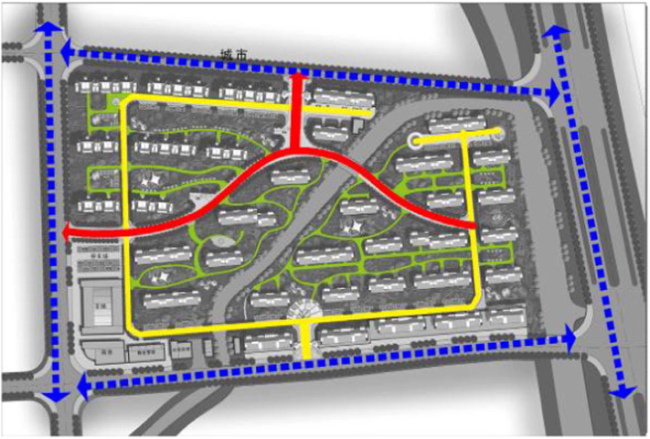 The planning roads are divided into three grades, the main road, secondary roads, and house roads. The main road refers to the road in a dynamic form that connects the entrances in east and west. It extends the visual space and reveals the smooth and natural beauty by the distinctive landscape and buildings at random change. The roadway width of the main road is 8 m.