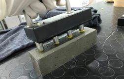 Para realizar este ensayo se siguió la norma UNE 83988. Se ha empleado un medidor de resistividad eléctrica (Figura 2), que consiste en comprobar cuánto le cuesta a una carga eléctrica atravesar el hormigón. Cuanto menos poroso es el hormigón presenta una mayor resistividad y, por tanto, mayor es su durabilidad frente a agentes agresivos. Se realizaron medidas de resistividad a los 1, 2, 3, 7, 14, 21 y 28 días de curado de cada probeta fabricada.