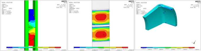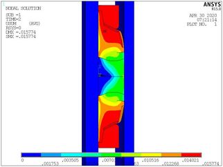 After the optimization of design parameters, the actual pressure bearing condition of rubber tube structure is simulated. The sealing pressure difference is set as 50 MPa, and the ambient temperature is 120℃. The bidirectional simulation sealing test of rubber cylinder is carried out (the solution of loading conditions is shown in the upper left of Figure 7). The sealing test results are shown in Figure 7. It can be seen from the overall deformation diagram of the rubber cylinder that the anti-outburst steel covers on both sides of the rubber cylinder have been fully expanded and close to the sleeve, which has realized the complete rigid support for the rubber material at the end of the low pressure side, and reduced the infiltration of gas at the high pressure side through the rubber cylinder material, thus preventing the occurrence of "gas explosion". As for the contact stress between the casing and the rubber cylinder, it can be seen from the radial path distribution of the maximum contact stress at the bottom right of Figure 7 that the minimum contact stress of the rubber cylinder is more than 50 MPa, and the maximum contact stress is greater than 1.1 times of the sealing pressure difference [9], which can meet the requirements of 50 MPa air tight sealing and pressure resistance at 120℃.