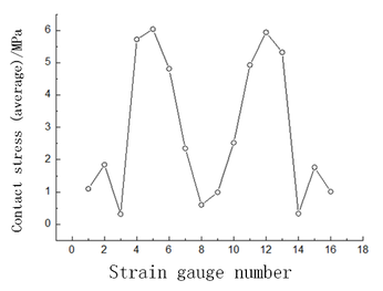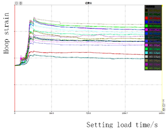 The setting test of rubber cylinder was carried out at normal temperature. Sixteen strain gauges were pasted axially at the outer casing of the test fixture, and the strain value of outer casing was tested by dynamic strain gauge at the setting stage. The setting load of 14.6 MPa (7.6T) was loaded by opening the dynamic strain tester, and the setting pressure gauge reading was about 14.6 MPa. Voltage 30 min after shut down the instrument data save, each strain gauge measuring the link to the strain changing with load time curve as shown in Figure 9 (a), the contact stress distribution of axial as shown in Figure 9 (b), test results show that the tooling without pressure, sealed performance is good, the plastic cylinder test is set by the axial stress distribution and plastic tube simulation test basic same, the validity of the finite element model is verified.