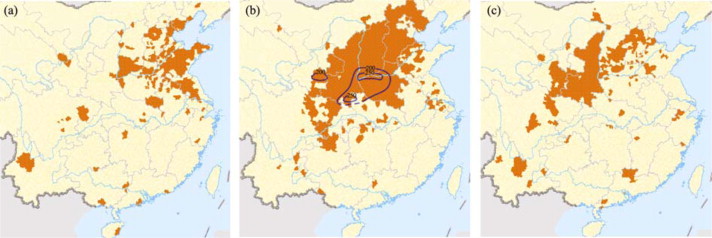 With ever-increasing famine, pestilence took place in 1877 (Fig. 2 ), with the northern epidemic areas dominantly in Hebei, Shanxi, and Henan, and, to less degree, in Shandong and Liaoning. The epidemic regions expanded in 1878, when the number of affected prefectures and counties more than doubled. “The pestilence is so strong that patients are prone to death” as written in the local chronicle of Jiangxian, Shanxi province, while for Jishan of the same province “Pestilence is spreading from summer to autumn, with the corpses piling up”. And for Xinyang of Henan the description is “Pestilence breaks out so terribly that the people are dying one after another in spring 1878. The survivals from the disaster are likely infected again. The relief gentlemen are busy with their affairs. Death occurs occasionally and becomes less and less after June”. The pestilence plague was eradicated only when the vast expanse drought and famine ended in 1879.
