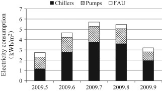 Unlike split AC systems, the centralized AC system includes the electricity consumption of water pumps and fans. According to system operation records from May to September 2009, the monthly electricity consumption of chillers, water pumps, and fresh air units is calculated as shown in Fig. 5 . The proportion of electricity consumption for water pumps and fans in each month ranges from 30% to 60%, which is approximately 0.5 to 1.4 times the chiller consumption. Therefore, the electricity consumption of the distribution system is a main contributing part in the AC system and is a major factor in the high AC consumption in this residential community.