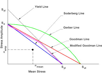 Existen en la bibliografía diferentes métodos para calcular la vida a fatiga de los materiales en función de la tensión alterna a la que están sometidos. En [1] se pueden observar resumidas las teorías clásicas (Gerber, Goodman, Soderberg) y sus diferentes variantes, Figura 1. Estas se fundamentan el cálculo de una tensión equivalente en función de la media y alterna, que es comparada con diferentes criterios teniendo en cuenta las resistencias elásticas y a rotura de los materiales. Otros modelos [2], tienen en cuenta además, la degradación del material con la acumulación de ciclos, y desarrollan en su formulación leyes de evolución de la resistencia y de la rigidez en función de las tensiones medias, alternas y número de ciclos. Modelos más evolucionados [3], desarrollan diferentes correcciones de la tensión media para mejorar la precisión del cálculo.