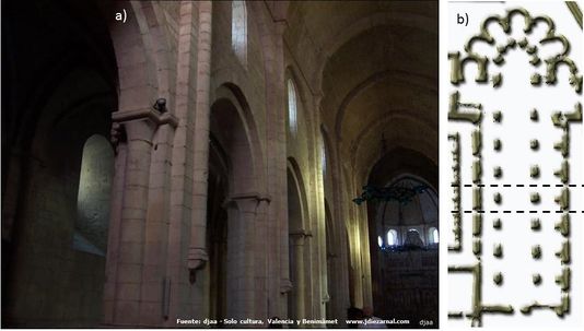 | Figure 31: Iglesia cisterciense del monasterio de Poblet. a) Vista interior de la nave central. b) Planta y sección analizada |