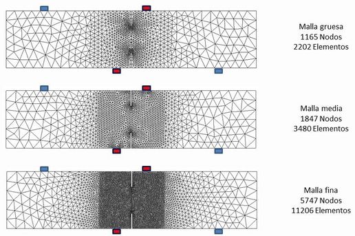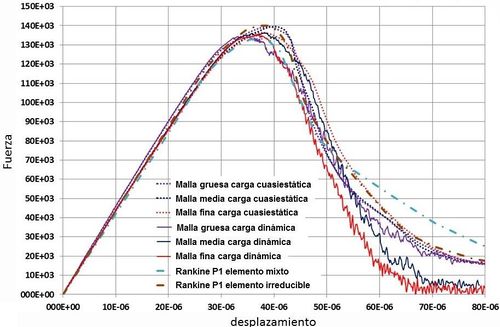 En la Figura 7 se muestra un detalle de las tres diferentes mallas utilizadas, formadas por 1165 nodos y 2202 elementos triangulares lineales para la malla gruesa, 1847 nodos y 3480 elementos para la malla intermedia y 5747 nodos y 11206 elementos para la malla fina. El análisis se ha realizado tanto forma cuasiestática como de forma dinámica, respetando la velocidad de aplicación de la carga. En ambos casos los resultados han sido muy similares como se observa en la Figura 9.