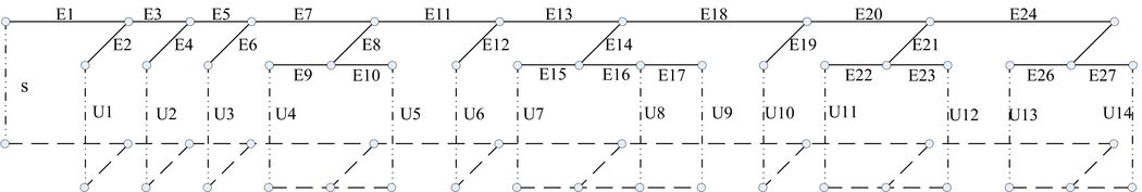 The heating network in this case has been running for about 10 years since it was put into use, and the heat inlet is equipped with self-operated pressure differential valve, remote heat meter, and temperature control valve in the household. The flow observation data of each household are collected through the heat meter and uploaded to the heating monitoring platform.Figure 2 shows the heat inlet device diagram of the case plot, Figure 3 shows the plan view of the heat supply pipe network of the case plot, and Figure 4 shows the topology of the heat supply system of the case plot, containing 1 heat exchange station and 14 heat inlets. To simplify the identification process, this paper simplifies the pipe section after the heat inlet into a pipe segment for identification, the solid line represents the water supply pipe segment, the dotted line represents the return pipe segment, and the dotted line represents the heat exchange station or the heating system in the building.