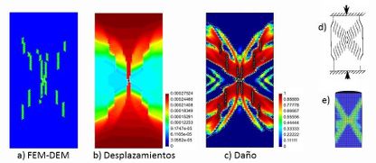 Una de las claves de la técnica FEM-DEM es el procedimiento para pasar el daño producido en un elemento finito, con la consiguiente degradación de la rigidez elemental, a una discretización de los labios de la fisura por elementos discretos de forma circular (en 2D) o esférica (en 3D).