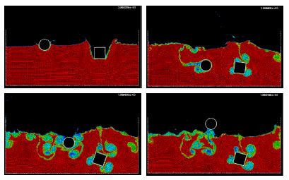 Figure 14 shows an example of a wave breaking within a prismatic container including a vertical cylinder. Finally Figure 10 shows the impact of a wave on a vertical column sustained by four pillars. The objective of this example was to model the impact of a water stream on a bridge pier accounting for the foundation effects.