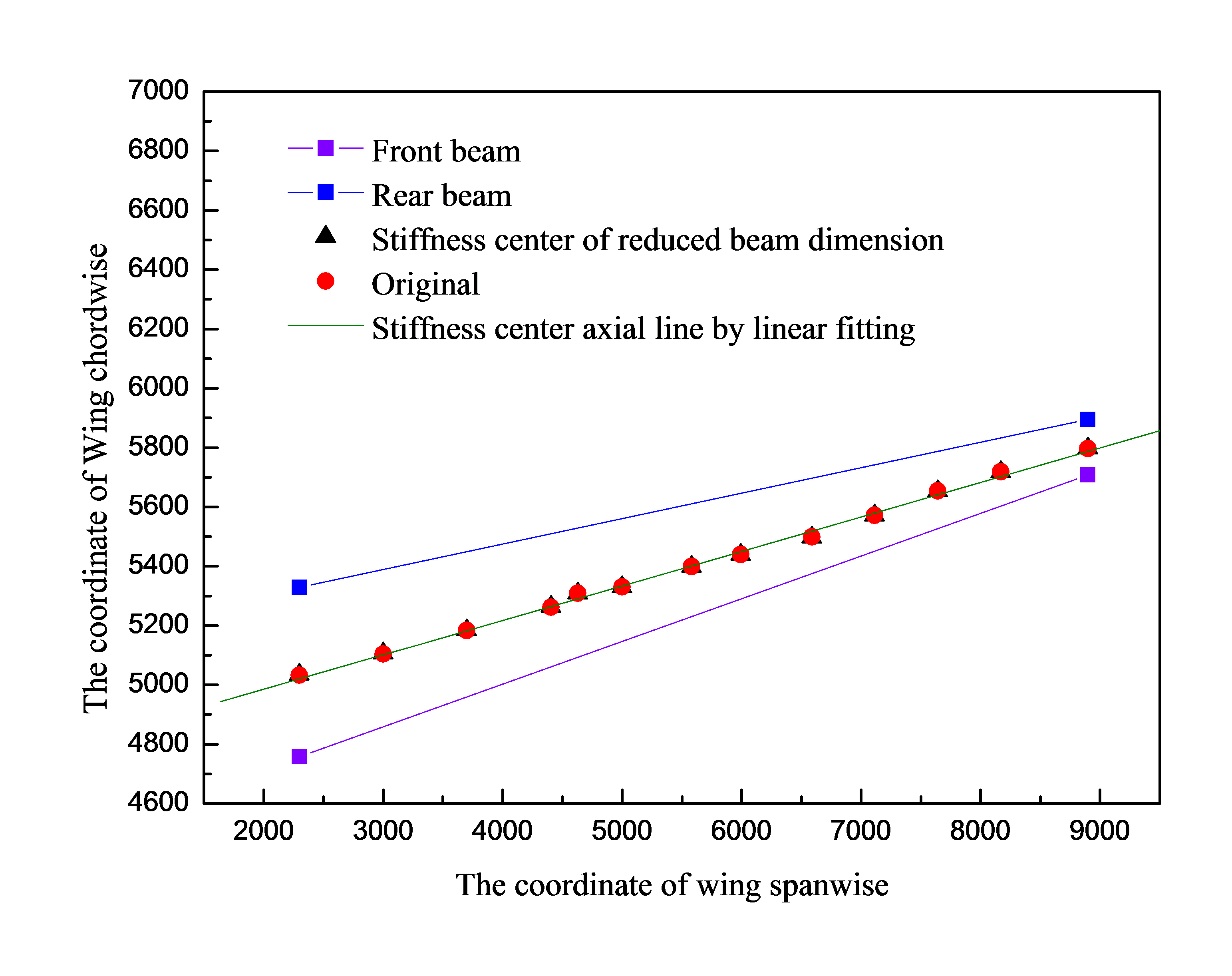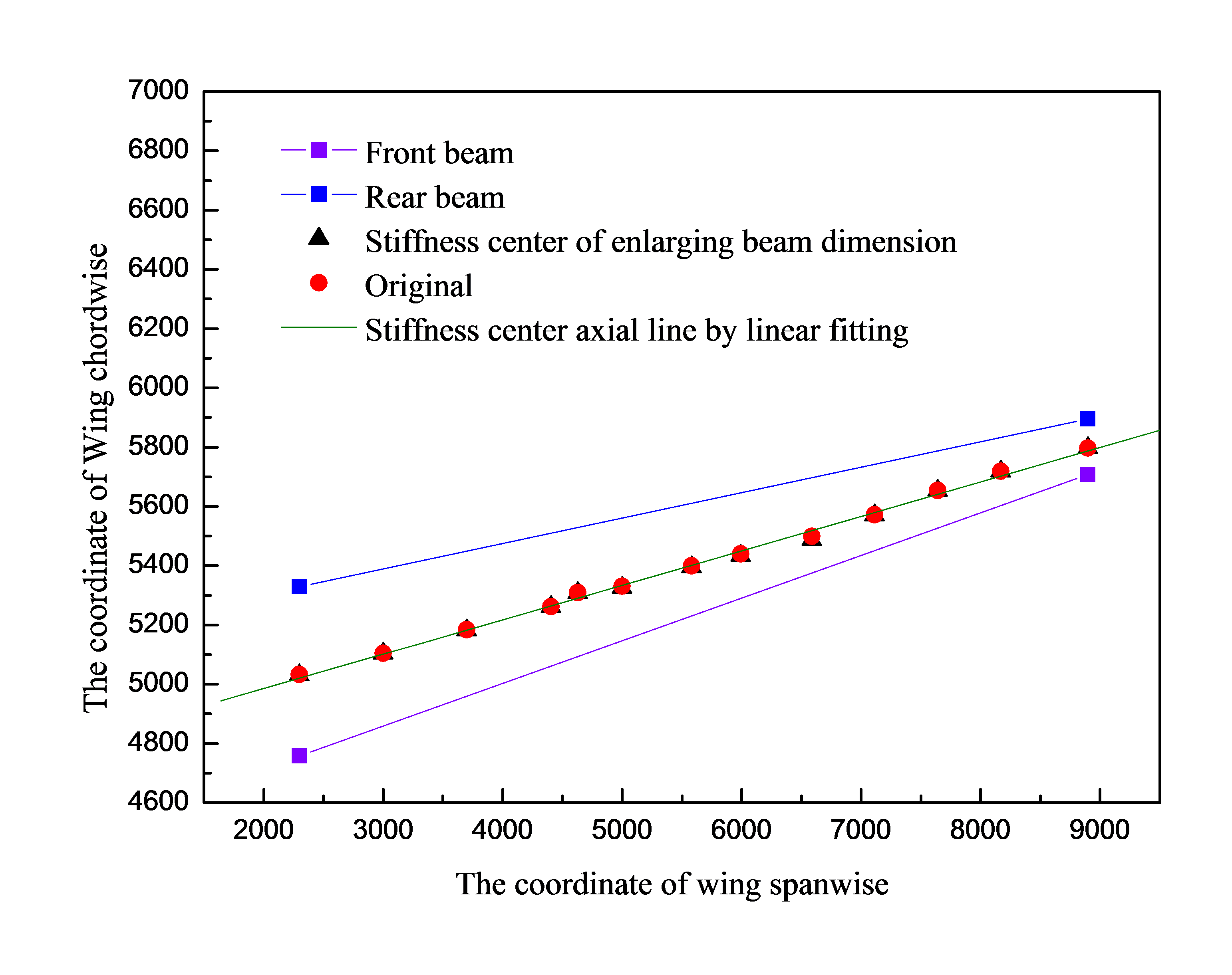 Wing cross section is shown in Fig. 3. Stiffness center of enlarged beam dimension is compared with the original by linear fitting as shown in Fig. 4. Similarly, the reduced beam dimension is also compared with the original by linear fitting as shown in Fig. 5. Spacing of front beam and rear beam in the position of wing root is 560.606 mm, which is 197.08 mm in the position of wing tip. If
