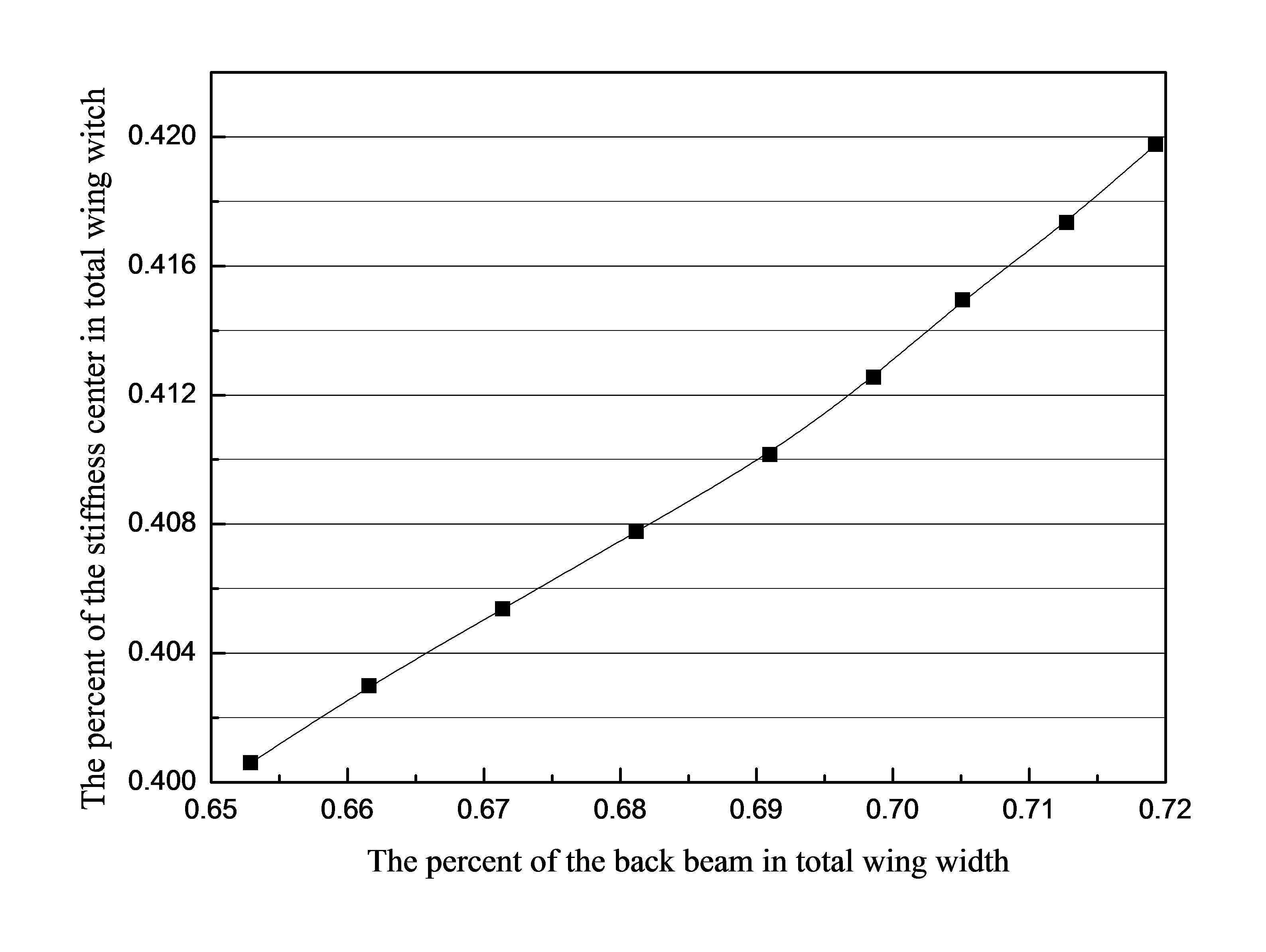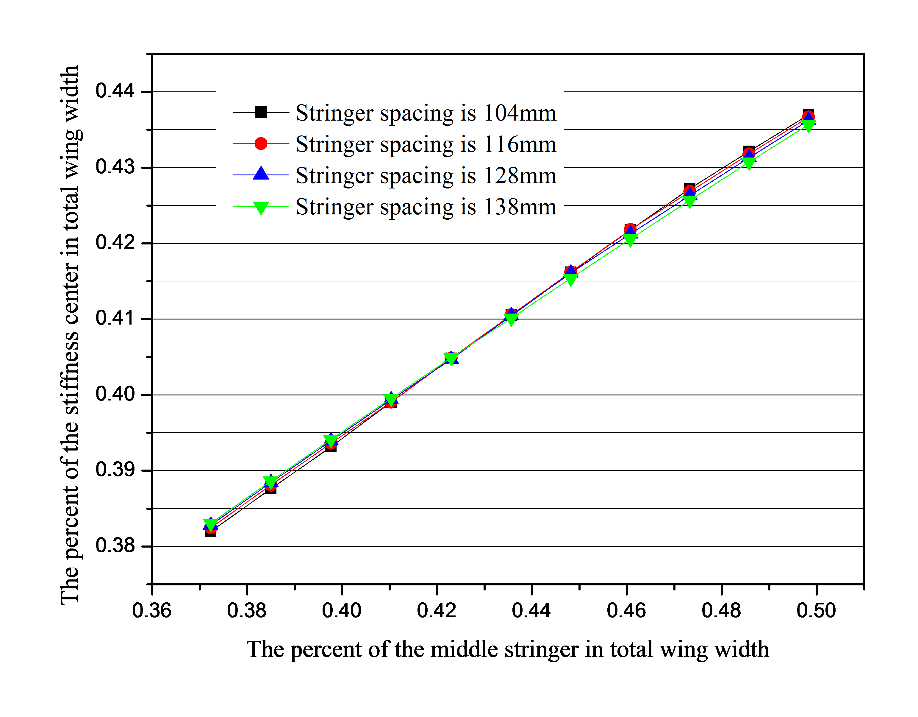 When changing the percentage of middle stringer positions of total wing width are from 37.232% to 49.828%, the percentage of the variation range of stiffness center positions in total wing width are individually shown in Table 5. It is indicated that stiffness center position has a great change for different models with different spacings of stringers, but has small impact on the spacing of stringers.