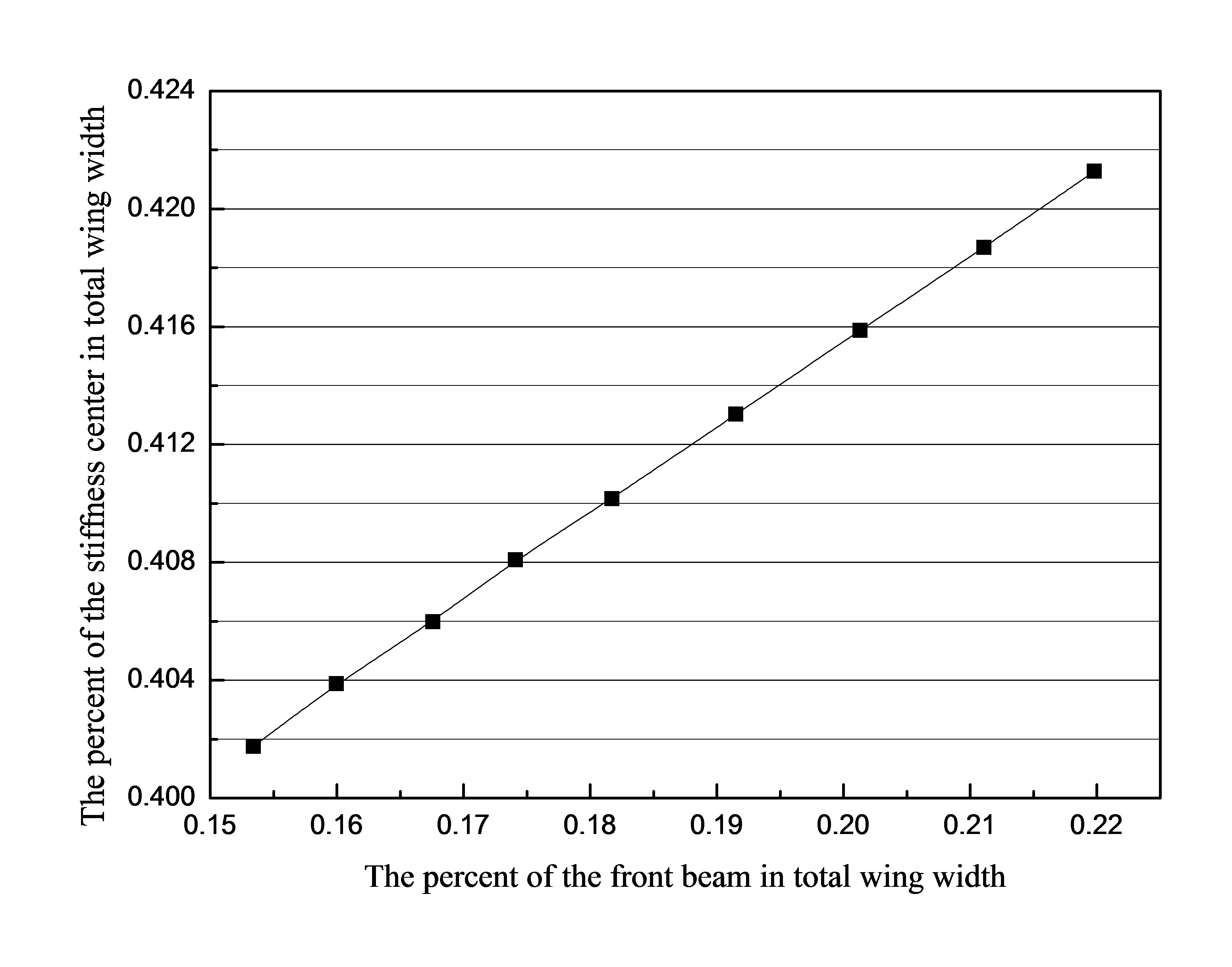 The position of the stiffness center is impacted by the layout of the front beam and rear beam. The positions of them were defined by percent of the distance between them and the front border with respect to the total wing width. When changing the percent of the front beam positions from 15.343% to 21.98% of total wing width, the percent of the stiffness center positions varies from 40.176% to 42.128% correspondingly. Similarly, when changing the percent of the rear beam position from 65.288% to 71.926% of total wing width, the percent of the stiffness center positions varies from 40.061% to 41.976% correspondingly.
