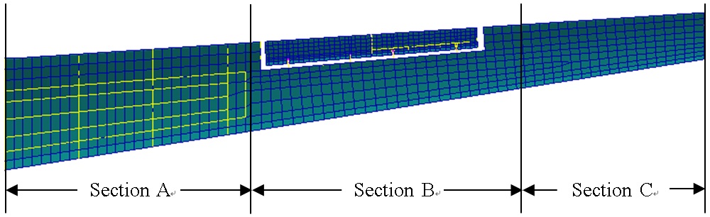 Stiffness center from wing root to tip is different. In order to research the impact of the beams, three wing stiffness centers are analyzed using three different wing models, which are original dimensions, enlarged beam dimensions and reduced beam dimensions at the same time, as shown in Table 1. The wing is divided into three sections according to different beam dimensions and numbers as shown in Fig. 2.