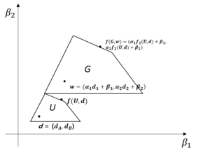 As suggested by Figure 1, the solution to the new bargaining problem f (G, w) can be derived from f (U, d) by applying the same transformation. The third axiom “symmetry” means, in a bargaining game, where the position of the two players is completely symmetric, the solution should also be symmetric. This means that if there is no information that can be used to distinguish one player from the other, the solution will also be indistinguishable between players, [42]. The last axiom is the most contentious. It states that if and is within the feasible area ( ), then . The concept is demonstrated in Figure 2.